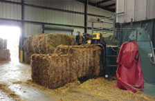 The receiving area at our baling plant is under roof, which reduces the amount of moisture in the finished product and makes shipping more economical. Most muck is stored outdoors which inevitably increases the moisture content as it is rained on, but we receive a significant portion of the muck delivered to our baling plant directly from barns, which makes it significantly dryer than the average racetrack load. In our feeding process, we use a loader to dump one bucket of dry material and one bucket of wetter material into our feeder box. The box then equally blends the two to make the moisture content much more consistent than if the loose material were directly loaded into a truck. While rain does have some effect on our bales, we have invested as much as possible to minimize this effect and keep your supply as dry and consistent as possible.